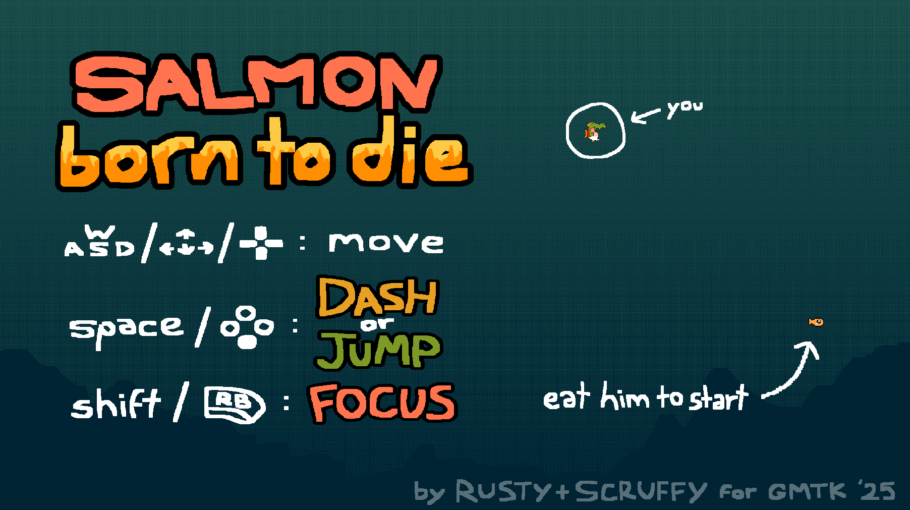 ride out the brutal life cycle of a hungry salmon! survive the feeding frenzy stage to climb the waterfall, jump over obstacles, and father a new generation! the more you eat, the bigger you'll get, so don't forget to use your FOCUS button to stay safe. see if you can survive the feeding frenzy long enough to eat the King!