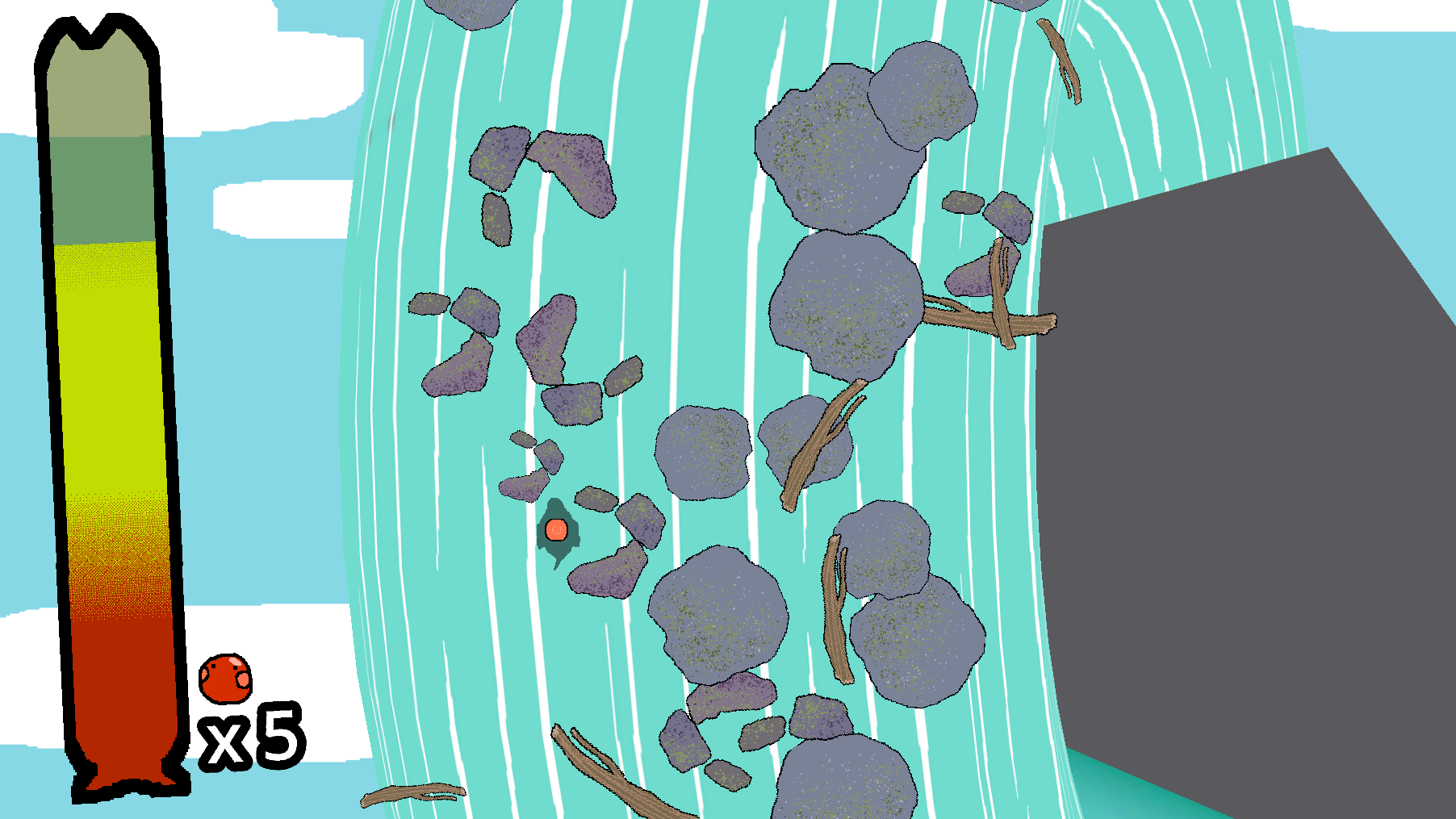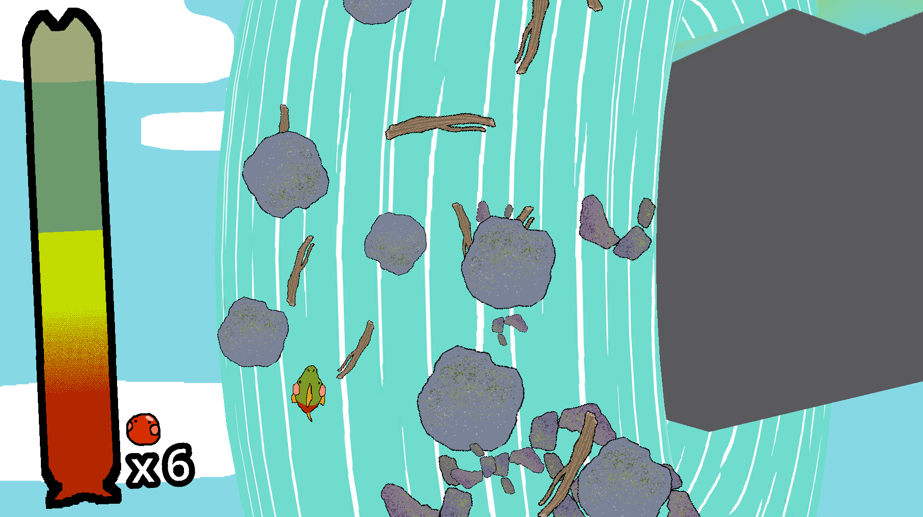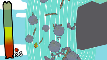 in the waterfall stage, try to use your FOCUS to avoid obstacles, but you'll need to JUMP over them when there's no way through! as you take damage and consume stamina, you'll become smaller and have an easier time dodging, but the more stamina you have when you reach the top of the waterfall, the more eggs you'll lay, meaning more lives & time in the next feeding frenzy!
